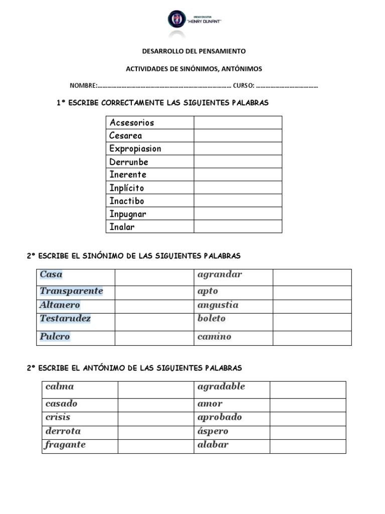 Actividades Sinonimos Pdf